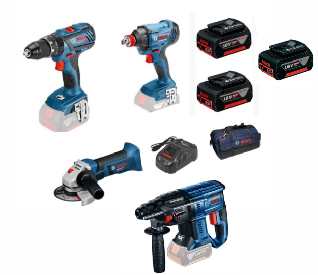 Powerful: performance of 55 Nm and 1,750 RPM for highest efficiency when working in wood, metal, and masonryRobust 13-mm Roehm metal chuck offers ideal power transfer for drilling and screwdriving.Brushless motor ensures tool lifetime and longer battery runtimes.Product Specification:Torque (soft/hard/max.): 28/55/- NmNo-load speed (1st gear / 2nd gear): 0 – 450 / 0 – 2 rpmChuck capacity, min/max: 1.5 / 13 mmTorque settings: 20Drilling in metal Vibration emission value ah: 1.5 m/s²Drilling in metal Uncertainty K: 1.5 m/s²Impact drilling in masonry Vibration emission value ah: 11.0 m/s²Impact drilling in masonry Uncertainty K: 1.5 m/s²Noise Sound pressure level: 88 dB(A)Noise Sound power level: 99 dB(A)Noise Uncertainty K: 5 dBGDR 18V-200 Features:High power in a compact sizeReady for all applications, thanks to 2 in 1 bit holder: 1/4 inch internal hex and 1/2 Inch square drive.Powerful in use even in hard to reach areas thanks to best head length to torque ratio.Product Specification:No-load speed: 0-3400 rpmNo-load speed (1st level): 0-1100 rpmNo-load speed (2nd level): 0-2300 rpmNo-load speed (3rd level): 0-3400 rpmTorque settings: 3Torque, max.: 200 NmImpact rate: 0-4000 bpmImpact rate (1st level): 0-2300 bpmImpact rate (2nd level): 0-3400 bpmImpact rate (3rd level): 0-4000 bpmTool holder: 1/4" internal hexagon and 1/2" external square GBH18V21 SDS DrillPowerful impact system with 2.0 J, 3 mode hammer for versatile usageReduced maintenance due to brushless motor and increased runtime per battery chargeNo sparks and less heat generation during use thanks to brushless motor Max. impact energy [J] - 2Impact rate at rated speed [bpm] 0 – 5.100Rated speed [rpm] 0 – 1.800Weight excl. battery [kg] 2,3 (2,4)Tool holder - SDS plusDrilling rangeDrilling dia. in concrete with hammer drill bits [mm] 4 – 20Opt. app. range in concrete with hammer drill bits [mm] 6 – 10Max. drilling diameter in metal [mm] - 13Max. drilling diameter in wood [mm] - 30 (13)Noise/vibration informationNoise levelThe A-rated noise level of the power tool is typically as followsSound pressure level 90 dB(A)Sound power level 101 dB(A). Uncertainty K= 3 dB.GWS18V10 Angle Grinder Bare Unit Highest material removal rate and cutting performance in its class per battery chargeExtremely robust and durable 4-pole high-performance motor for a long lifetimeCompact design and low weight (only 2.1 kg) for comfortable working, especially in tight spaces and overheadUnique Bosch Premium lithium-ion technology for 400% longer lifetime and unbeatable battery runtimeBosch Electronic Cell Protection (ECP): protects the battery against overload, overheating and deep dischargeBosch Electronic Motor Protection (EMP) protects the motor against overload and ensures a long lifetimePractical battery charge level indicator: constantly shows how much energy is left in the batteryGear head can be rotated in 90 degree stepsHandle can be used on right or leftAnti-rotation protective guard - quickly and easily adjustable, provides reliable protectionBosch Hyper Charge: due to the rapid charging process, the batteries are charged to 75% after just half of the charge timeNo memory effect: the battery can be charged regardless of the charging state at any time, without damaging the cells Product Specifications No-load speed - 9.000 rpmBattery voltage - 18V (Not Supplied)Weight incl. battery - 2.1kgGrinding/cutting disc, diameter - 115mmRubber backing pad, diameter - 115mmSound pressure level - 82 dB(A)Sound power level - 93 dB(A)Uncertainty K - 3 dB