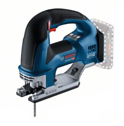 Cordless GST 18V-155 BC Professional with brushless motor and well-balanced tool design. Features robust, die-cast aluminium base plate with 2 fixing points for increased stability and safety, bow handle, top handle gripping area and variable speed trigger for optimal tool control. Adaptive Speed Control (ASC) supports high precision when starting the cut, and saw blade guidance prevents blade bending even in small curves, and supports work. Large saw blade ejection lever and drop control ensure increased user health and safety. Also features connectivity module providing important tool information and allowing individual speed and light settings. Compatible with external dust extraction.