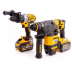 This 54-volt Flexvolt li-ion cordless twin-pack brings together one of DeWALT's best performing brushless heavy duty combi drills with a 54 volt brushless SDS Plus 3 mode hammer drill featuring a high capacity XR Flexvolt 9.0Ah 18 volt/54 volt Lithium-ion battery platform for extreme runtime and reduced maintenance.