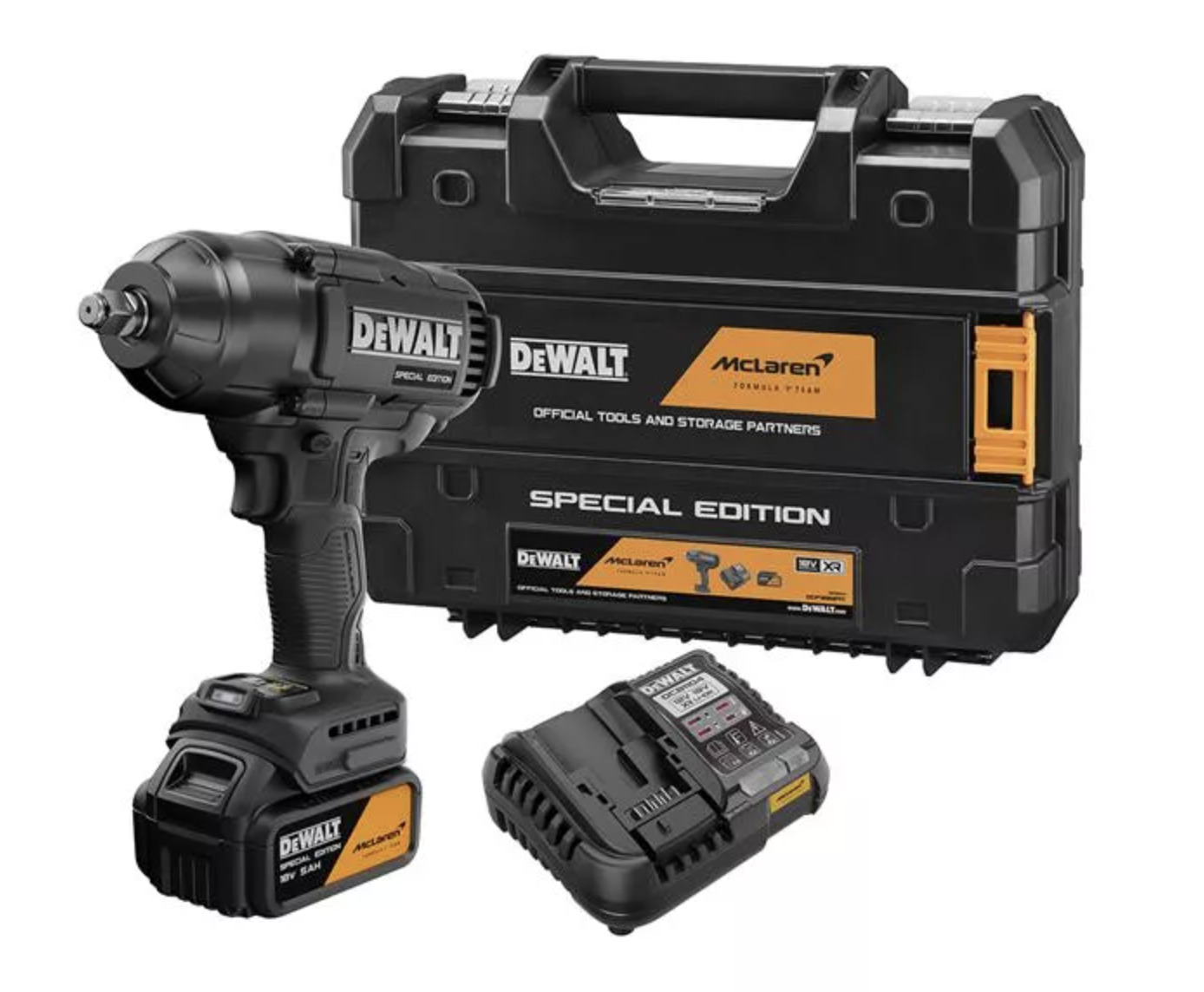 Special Edition DEWALT DCF99MP1T McLaren F1 High Torque Impact Wrench with a 1/2in square drive with hog ring for quick socket changes. Its XR brushless motor delivers high performance, extends tool life and allows for a much shorter design.