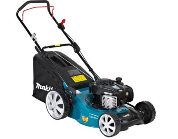 The Makita PLM4626N Petrol Lawnmower is recommended for lawns up to 1,200sq meters. It is fitted with a powerful and environmentally friendly 4-stroke engine. That gas low noise and clean exhaust emission. The solid steel housing provides increased durability and reliablity. It also has low running costs.