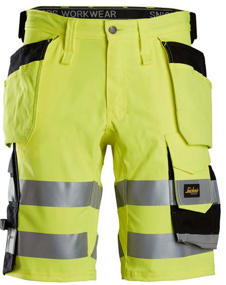 Slim-fitting, high-visibility Class 1 shorts with holster pockets that are fit for craftsmen working in the general construction, roadworks, or transportation sectors.