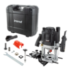 80mm Plunge Depth is ideal for deep cutting applications. Perfect for lock jigs, worktop joints and timber profiling.Precision Centring System to ensure perfect concentricity between cutter and guide bush for pinpoint accuracy with routing jigs.Router Table Compatible with height adjuster to easily and safely change cutting height from above the table.Constant Speed Control monitors the spindle RPM and adjusts automatically to maintain cutter speed for smooth and consistent cuts.11-Level Variable Speed Control offers precise control across a wide range of cutters, materials and applications.Vertical Extraction Spout prevents extraction hoses from ‘snagging’ on jigs and materials.Twin LED Worklights illuminate the cutting area to improve safety and accuracy in low-light situations.Extra-Wide 75mm Base Aperture to accommodate over-size cutters, such as panel raisers.7-Position Rotating Turret with pre-set plunge depth limits for fast, repeatable batch and stepped cutting.Micro-Adjustable Fence with Extraction Port featuring adjustable facings and 0.1mm increments for accurate edge rebating, grooving and mouldingFine Height Adjuster with an easy-to-read display for precision depth adjustments. 1 rotation equals 2mm height adjustment.Trend Base Configuration is a standardised fixing pattern of holes that allow routers to be attached to a range of compatible router tables, jigs and accessories.Ergonomic Inclined Handles feature an integrated power trigger and a soft grip moulding for comfortable operationDouble Locking Collet prevents accidental cutter ejection while a multi-spline profile ensures concentric clamping of the cutter shank.Moulded Carry Case provides safe storage for router and accessories.